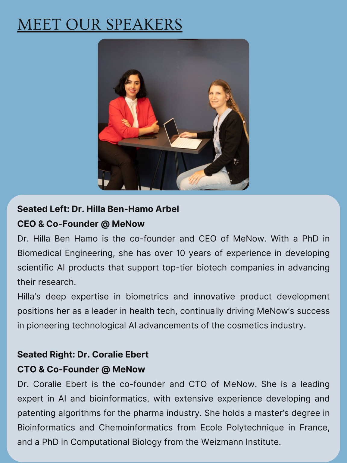 Additionally, the increasing interest in natural extracts in cosmetics, which may contain hundreds of active molecules, presents another significant challenge as well as an opportunity. In this presentation, Dr. Coralie Ebert, co-founder of MeNow, will explore how AI can address these challenges. She will propose approaches for using AI to predict the effects of cosmetic ingredients and formulations on the skin. A methodology for in silico predictions of synergistic effects, compared to in vitro methods, will also be presented. Lastly, one of the final points discussed will be the use of AI to optimize extraction processes and discover new active molecules that were previously unknown.